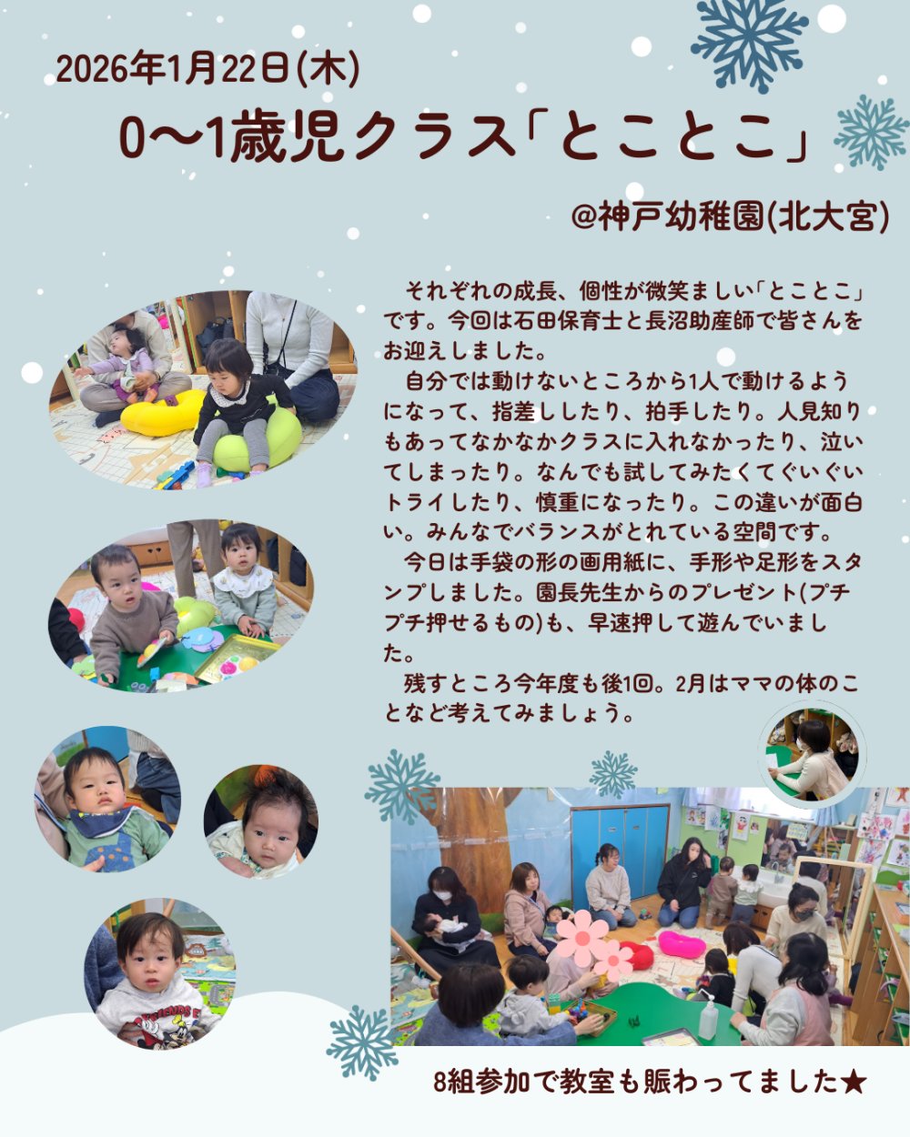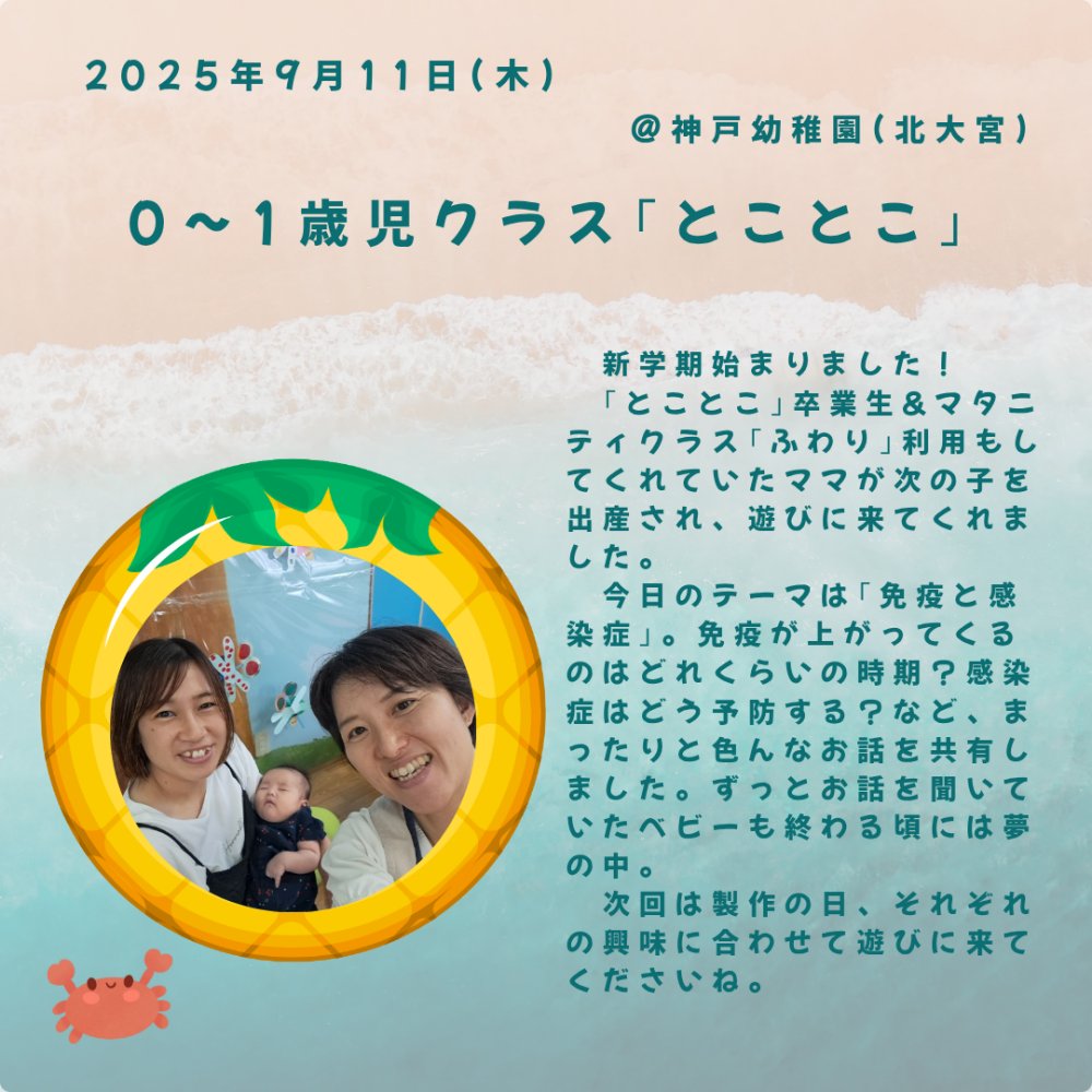 持ち物:母子手帳、ご家族の方のうわばき、バスタオル、着替え、おむつ、ミルク等、お子様に必要なもの